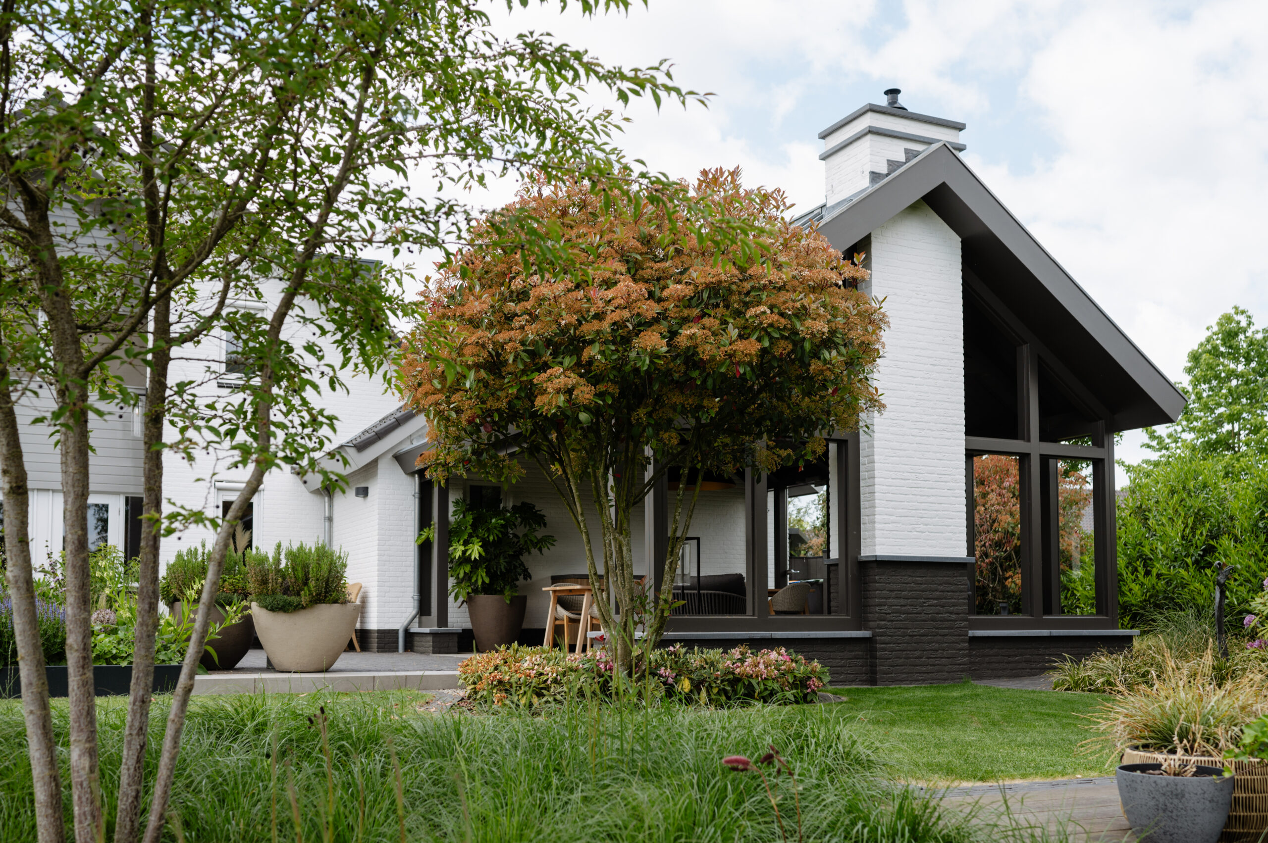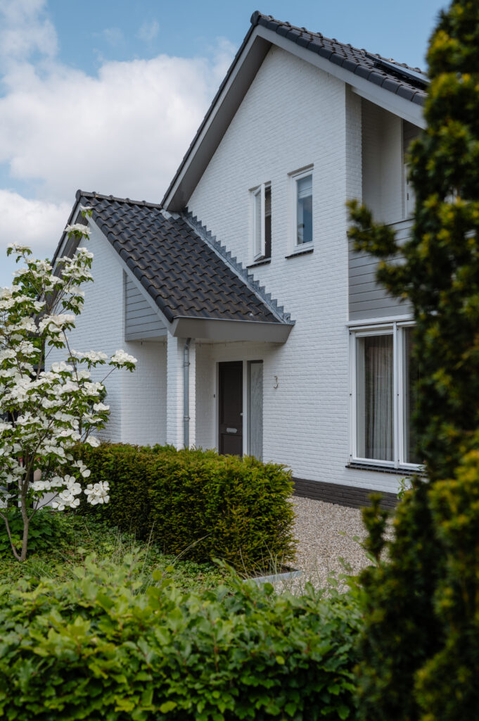 door het geplande herontwerp van de tuin van deze woning te combineren met een nieuwe kleurstelling van de bakstenen gevel en van de houten gevel- en boeidelen, krijgt de woning een frisse en eigentijdse uitstraling. de warme kleur van de houten geveldelen zorgt voor een mooi contrast met de witte gevel, maar voegt zich tegelijkertijd ook bij de natuurlijke kleuren van de tuin.