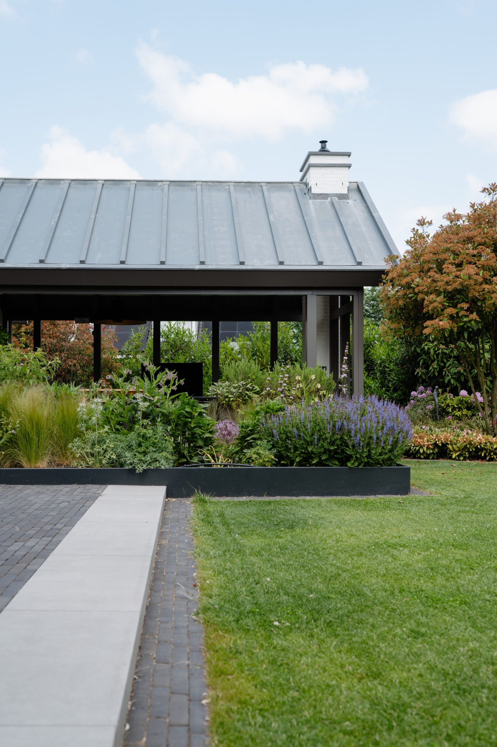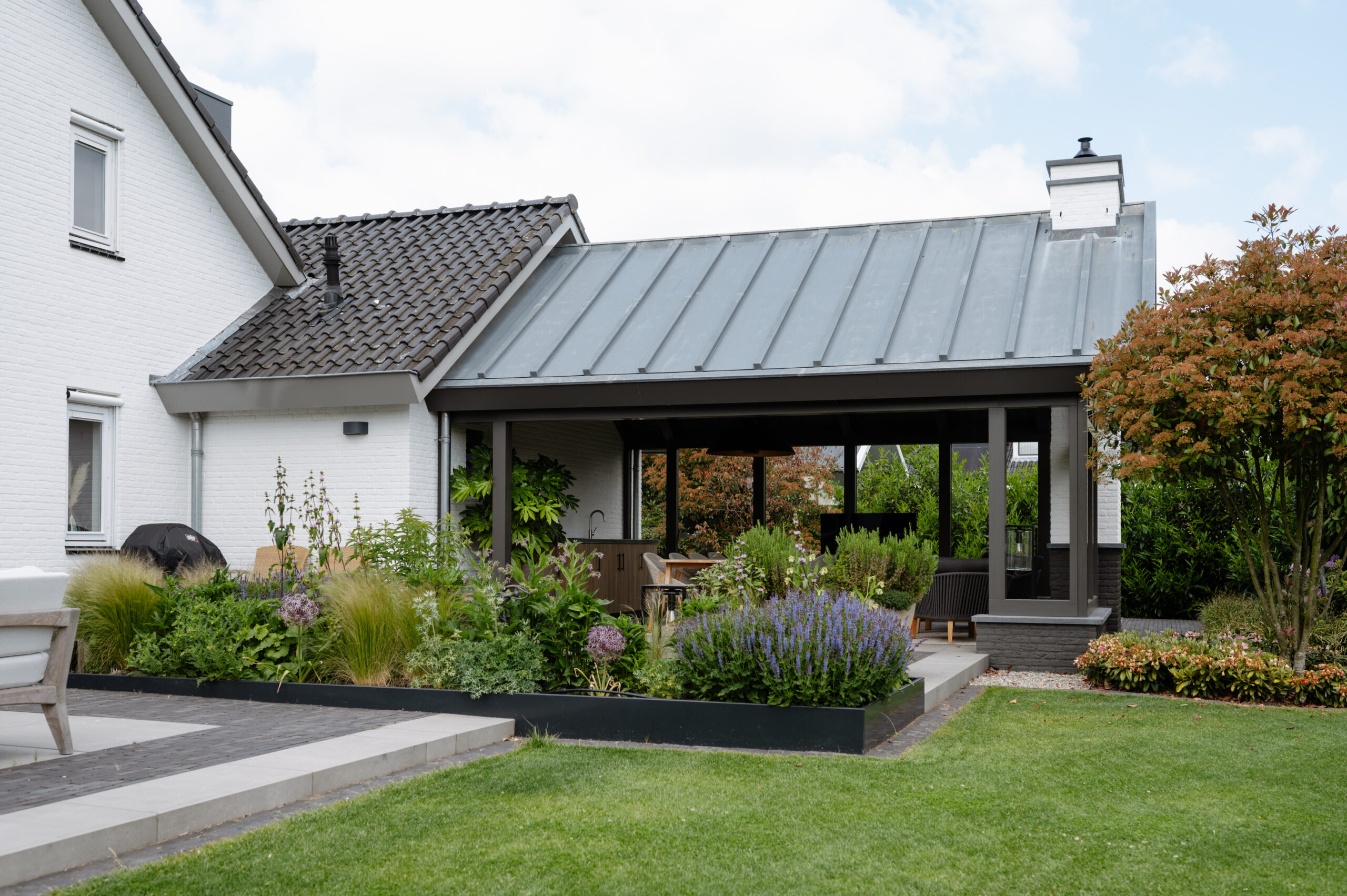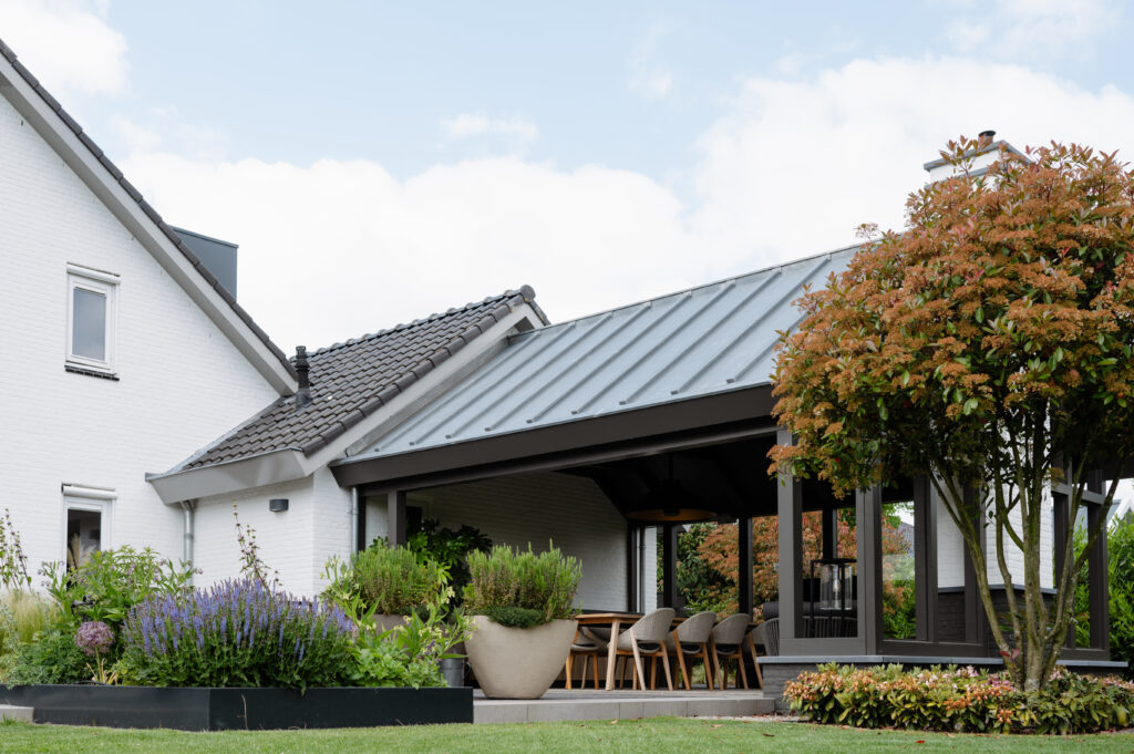 de nieuwe tuinkamer aan de achterzijde is een eigentijds vervolg op een bestaand landschap van daken. In vorm is het een verlengde van de bestaande woning, in materiaal en verschijningsvorm een duidelijk nieuwe toevoeging. door de kleurstelling af te stemmen op de nieuwe kleurstelling van de bestaande woning vormt het tezamen een geheel.